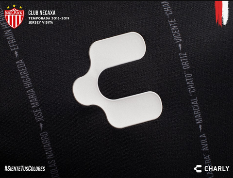 Charly imprime une version grise de son logo sur le côté droit de la poitrine tandis que le bouclier de Necaxa est placé au centre de la poitrine dans sa version standard actuelle.